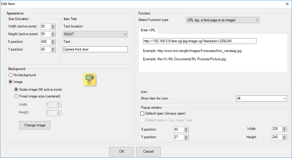 - Cette fonction affiche les données d’une caméra IP (MJPEG file) quand vous cliquez sur l’élément GUI.