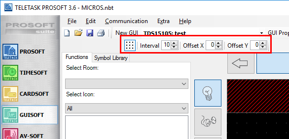 Pour positionner plusieurs items sur votre écran GUI, vous pouvez utiliser la grille. Pour afficher/activer la grille, il vous suffit de cliquer sur l’icône grille dans la barre d'outils Grille juste en dessous de la barre d'outils standard. Dès que la grille est activée, les icônes seront alignés sur la grille. La grille peut être adaptée comme vous le désirez dans la barre d'outil Grille.