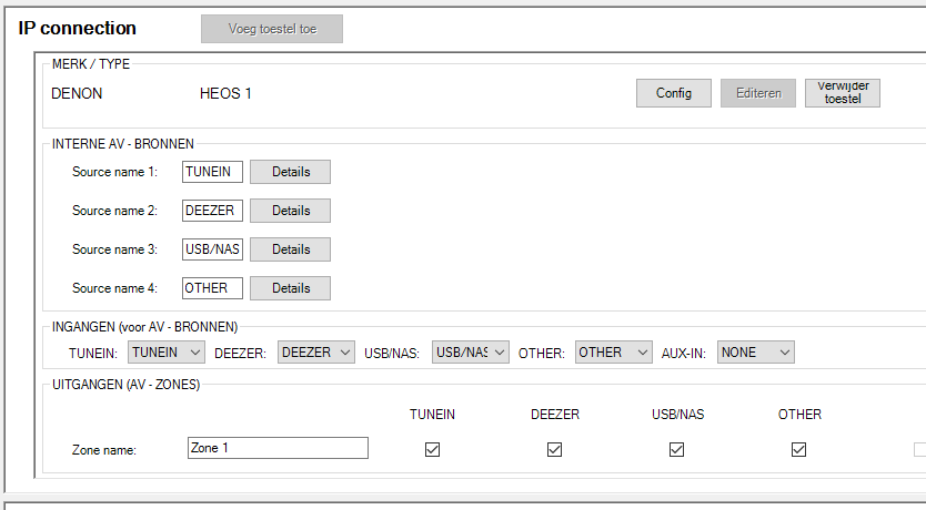 - Outputs contains the Zone name (which will be used on our touch panels and apps) and a toggle for each of your device's sources. Disabling a source will hide it from our touch panels and apps.