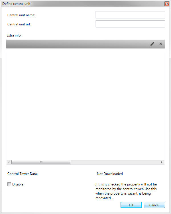 At the bottom there is also information about whether the Control Tower configurator has already downloaded the Control Tower Data for that Central Unit. When defining a new Central Unit this will always be ‘not downloaded’. When finished click ‘OK’ to add a Central Unit with the given data. You will now return to the overview list and the Control Tower configurator will try to download the Control Tower client data for the Central Unit.