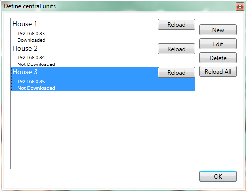 For each Central Unit you will see the same information again: the name, the url and the ‘Data state’. In this example the data for ‘House 1’ at url ‘192.168.0.83’ has been downloaded, for the other Central Units the data has not been downloaded.