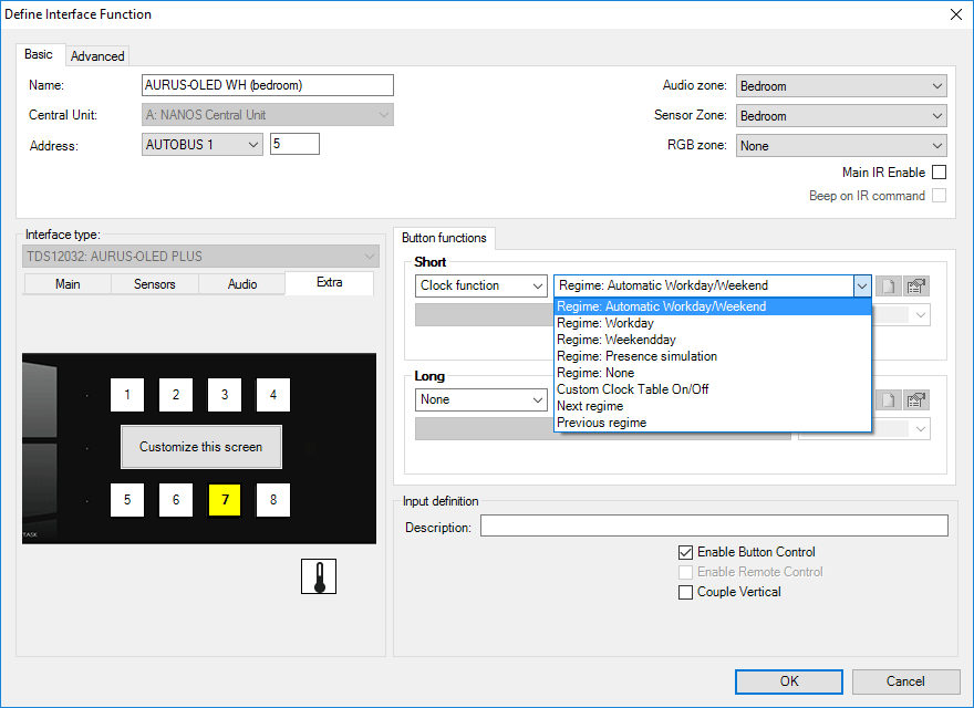 - Schakelt naar het volgende regime. De volgorde van de regimes is: Auto -> werkdag -> weekends -> simulatie -> geen -> Auto -> ...