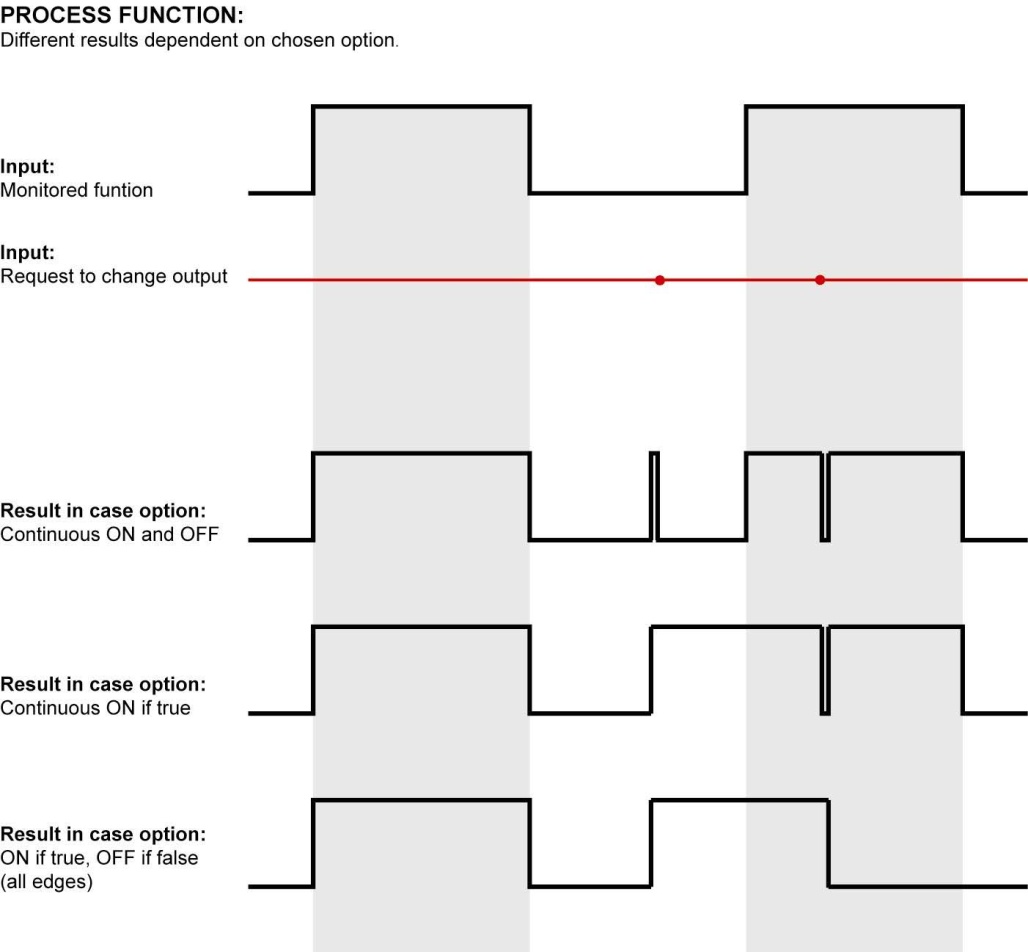 De 'Proces' functie bewaakt tijdens de actieve status, continu de status van een instelbare functie. Dit is de conditionele functie. Afhankelijk van de status van de conditionele functie wordt een instelbare functie geschakeld. Dit is de actieve functie.