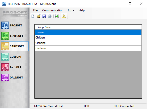 When clicking on the CARDSOFT button in PROSOFT Suite (in the bar on the left). Depending on the ‘Access control mode’ you will see an overview of the ‘Groups’, the ‘Users’ or the ‘Users and Groups’
