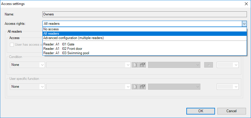 - the user has access on all readers, a single condition and user specific function can be defined
