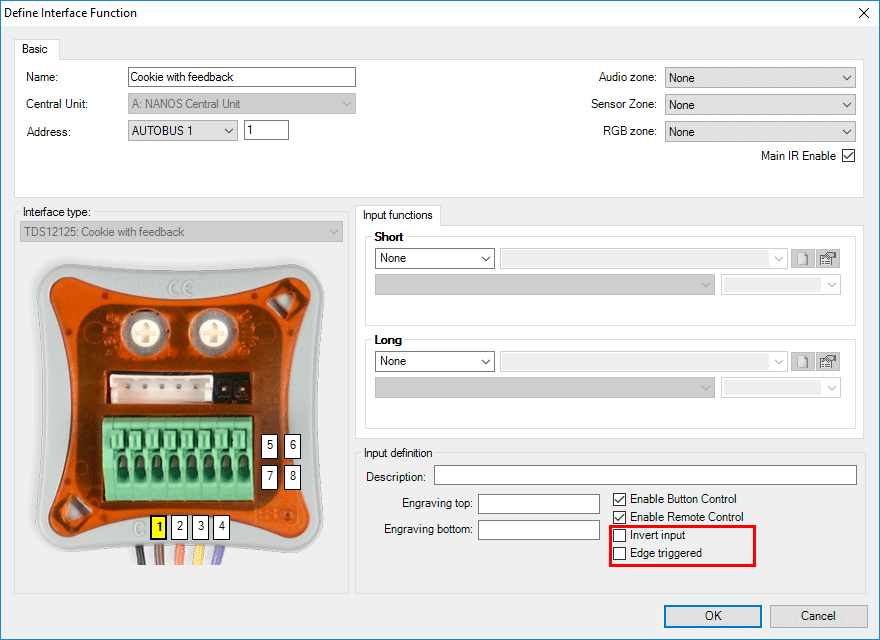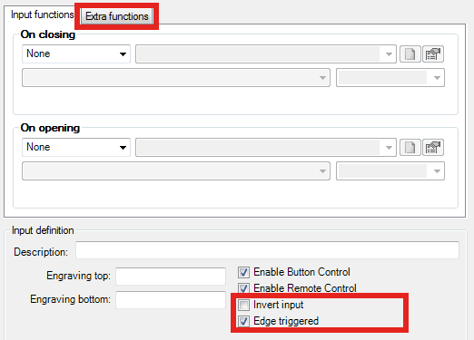 When an input works ‘Edge triggered an ‘Extra function’ tab will be available on which a second ‘on closing/on opening’ pair of functions can be defined.