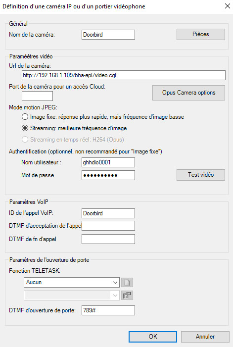 An authentication user and password are necessary for accessing the video stream of the output Doorbird unit. These informations are to be defined in the Doorbird app.