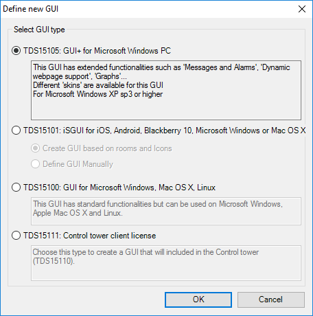 Nadat u het type GUI geselecteerd heeft, kan de configuratie starten. In GUISOFT start men steeds met het bepalen van de noodzakelijke eigenschappen voor de nieuwe GUI op basis van het doelsysteem: resolutie, connectie, skin, ...