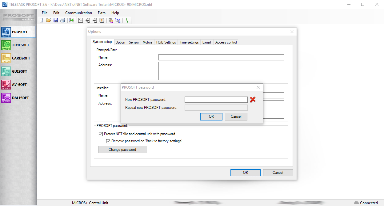 - ‘;Security’: Vink " Protect NBT file and central unit with password " aan als u wenst onbevoegden toegang tot het .NBT bestand te weigeren. Wanneer het .NBT bestand is beveiligd met een wachtwoord zal het: