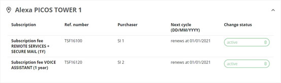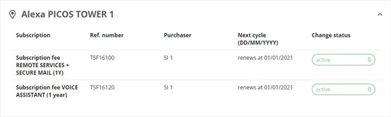 Er zijn abonnementen aangekocht op de installatie (in ons voorbeeld) genoemd ‘Alexa PICOS TOWER 1’ door ‘SI1’