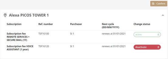 Fig: De hernieuwing van het Voice assistent abonnement staat nu ‘deactivated’ (=non actief) maar moet nog geconfirmeerd worden (zodat ‘renews at…’ verandert in ‘expires at …’).