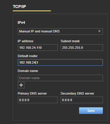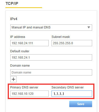 You enter your router IP address (in our example below this is 192.168.24.101) as first DNS server. As second DNS server you can for example use the Google DSN server 1.1.1.1. If the first is not available at camera startup (when it needs a time stamp), the camera will check the secondary time server.