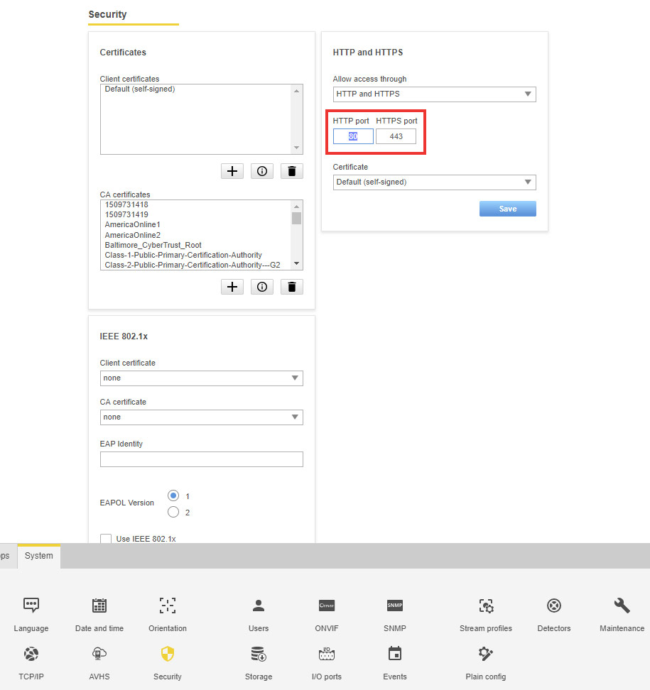 In our case you use the P1447-LE cameras (newer model July 2018), the settings menu is different than for the P1427-LE (older model). You can’t enter a secondary port in the P1447-LE settings, but instead you need to change the default port 80, to your preferred port (ig: 10004). For this, you need to use the ‘security’ icon.