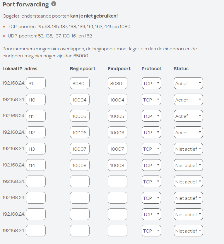 Important: you need to enter the port number twice (Beginpoort and Eindpoort are equal) and make status ‘Actief’.