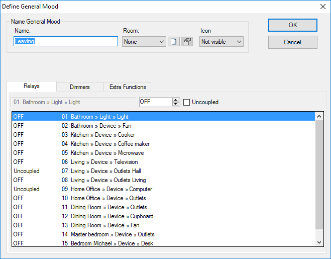 - Dans l’onglet relais, vous pouvez sélectionner chaque relais et définir l’état désiré, vers lequel le relais doit commuter lors de l’activation de l’Ambiance Générale.
