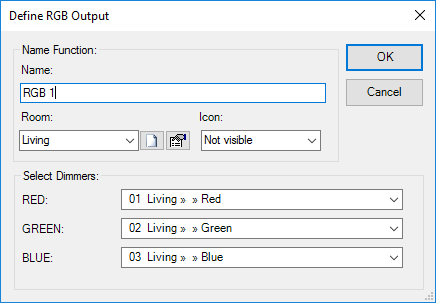 dans ce champ, vous pouvez sélectionner les trois variateurs d’éclairage qui constituent ensemble l’éclairage multicolore. Il y a 1 variateur d’éclairage prévu pour la couleur rouge, 1 pour la couleur verte et 1 pour la couleur bleue.