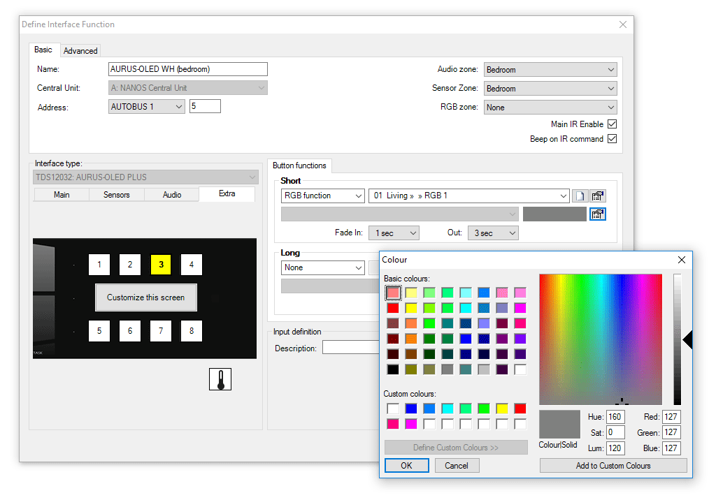 lors d’un appui court sur la touche, la fonction “RGB” est mise à la couleur définie. Si la fonction "RGB" était déjà configurée à cette couleur, elle est désactivée (tous les variateurs d’éclairages seront désactivés).