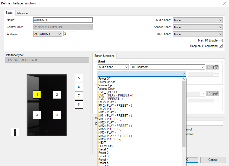 - ce paramètre définit la Zone Audio pour laquelle les différentes fonctions audio doivent être affichées. Vous ne pouvez sélectionner une valeur dans ce champ que si la Zone Audio a été définie dans une interface audio TELETASK.