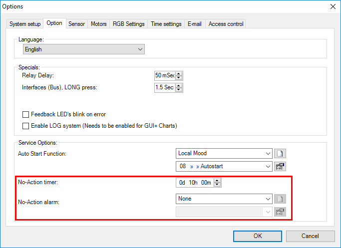 - Sélectionnez ici la fonction qui doit être activée quand il n’y a pas de mouvement détecté pendant le “Temporisateur Pas-d’Action”. Les fonctions suivantes peuvent être sélectionnées: “Interrupteur”, Ambiance Locale, Ambiance Locale Temporisée, “Ambiance Générale” et “Fonctions Processus”. Selon la fonction sélectionnée, quelques paramètres spécifiques à la fonction doivent être configurés. Consultez la description de la fonction sélectionnée à ce sujet.