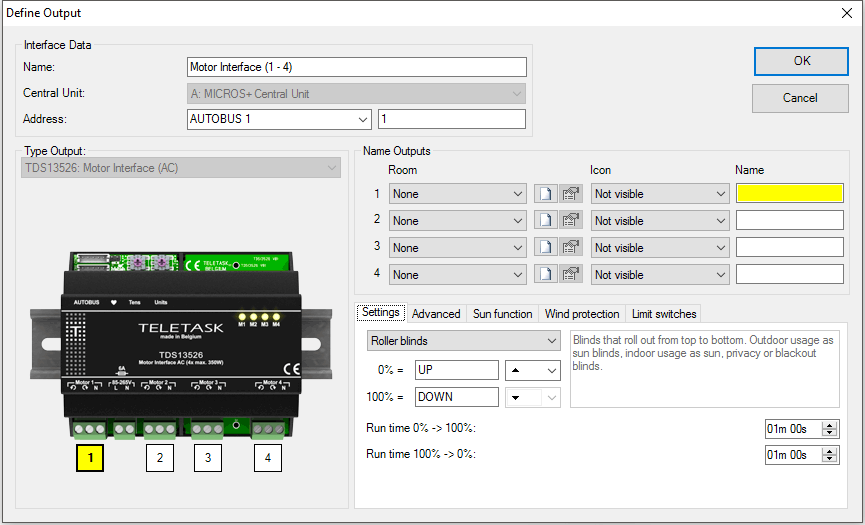 - définit comment les relais de TELETASK sont connectés au moteur réel, il existe quatre types (pour plus de détails sur les différents types voir plus loin dans ce chapitre):