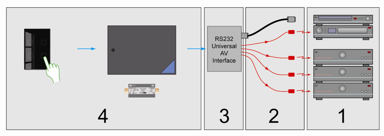 To realize the integration of audio/video with the RS232 universal AV interface in a fast and correct way, it is necessary to use a phased set-up. The different phases may look different than you would expect at first sight. Start at the right with '1' on the figure below and step to the left to finalize the installation process.