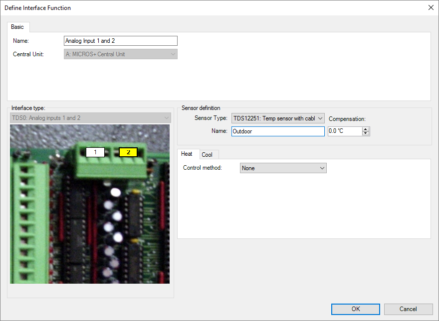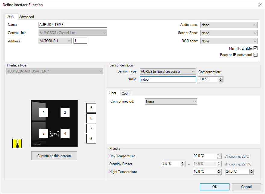 In this example we will use an AURUS temperature sensor where the ‘cooling’ output is not used. This can be, because no cooling has been integrated, or because the integrated HVAC system uses its own internal temperature sensors.