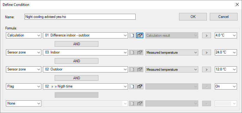 In this step we will create a condition that must evaluate to ‘TRUE’ to activate the ‘Night cooling’. We define the requirements to activate night cooling as: