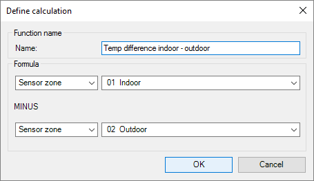 The first part of the condition above evaluates if the difference between the Indoor and the Outdoor temperature is higher than 4 °C. To calculate this difference we use a ‘Calculation function’. The calculation function can calculate the difference between two temperature sensor values.