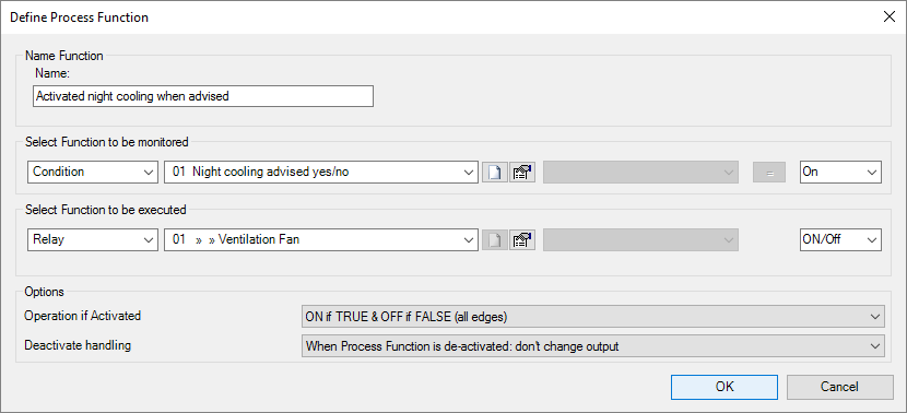 We have now defined or ‘Condition’ to check if it is advisable to us ‘night cooling’, all that remains is to activate it when necessary. To do this we will use a ‘process function’. This ‘process function’ will monitor our ‘condition’ and switch a relay ON or OFF accordingly.