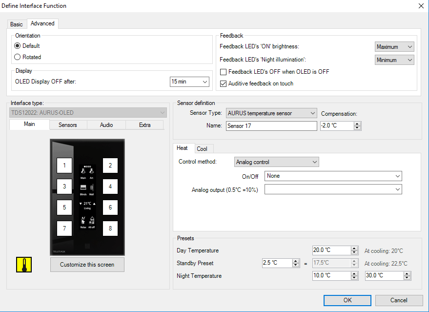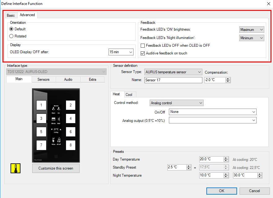 - Pour l’AURUS-2, l’AURUS-4XL, et l’AURUS-OLED (TDS12022), il y a une option supplémentaire dans les "Données de l’interface": le choix entre 'Default' ou 'Rotated'. Ceci indique si le Panneau de commande est monté horizontalement ou verticalement.