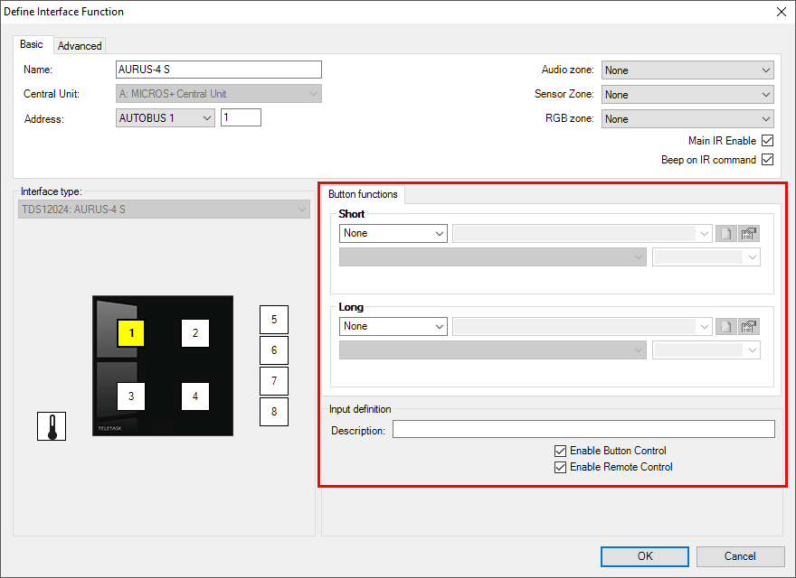 - Quand ce paramètre est coché, chaque touche peut être commandée par la télécommande TELETASK. Cette commande par télécommande peut être ensuite désactivée bouton par bouton. Si ce paramètre n’est pas coché, la commande depuis la télécommande TELETASK n’est pas possible.