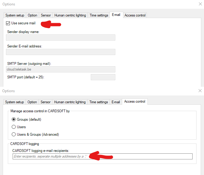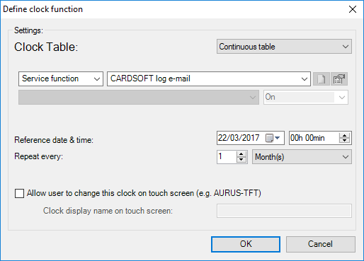 E-mail reports can be scheduled using TIMESOFT, or can be requested by the user (e.g. by activating a local mood). The configuration is the same from TIMESOFT or a function: using the 'Service function' (only available when there are one or more e-mail addresses defined in the access control options in the CARDSOFT logging field of the Extra > options > Access control menu).