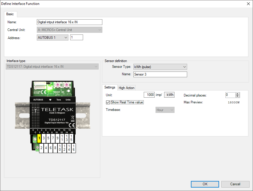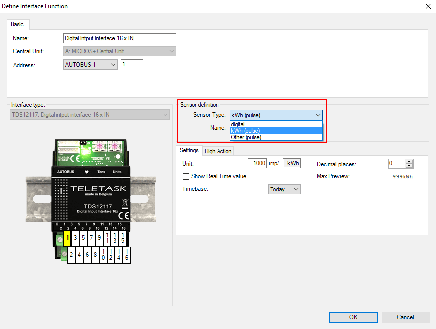 Standaard wordt er een sensor aangemaakt voor het meten van elektrisch verbruik (kWh). Voor het meten van andere eenheden, kan je het type sensor veranderen naar ‘Other’ Om de ingang terug naar een ‘normale’ digitale ingang om te vormen verander je het sensor type naar ‘digitaal’.
