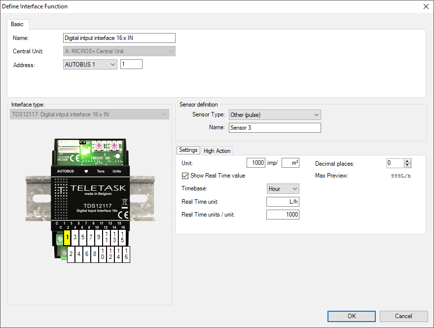 De meter die de pulsen genereert, moet aangesloten worden op de ingang van een TDS12117 (digitale ingangsmodule).