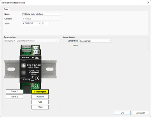 - L’interface P1 (TDS122340BE) peut être considérée comme un 'capteur' dans PROSOFT, de sorte que ses paramètres tombent dans le groupe 'capteurs'.
