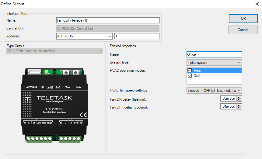 En général, un ventilo-convecteur est installé dans chaque pièce (comparable aux unités intérieures dans un système VRV). Un ventilo-convecteur ne mesure pas la température, de sorte qu'un capteur de température TELETASK doit être utilisé, par exemple celui d’un panneau tactile AURUS ou un capteur de température TDS12250 TELETASK.