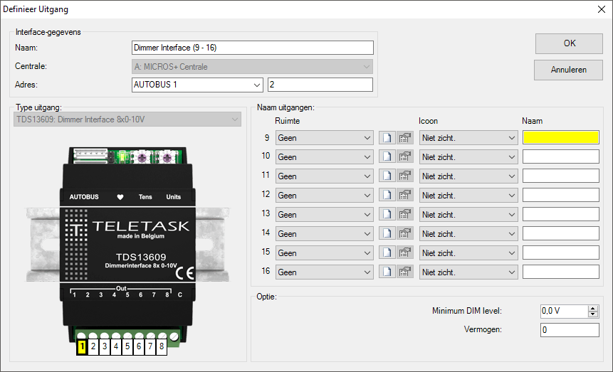 For some lights, dimming only works between a minimum voltage (e.g. 2.5V) and 10V. On the TDS13609 you can therefore specify a ‘Minimum DIM level’ on each output individually. The Minimum DIM level can be set from 0 to 4V.