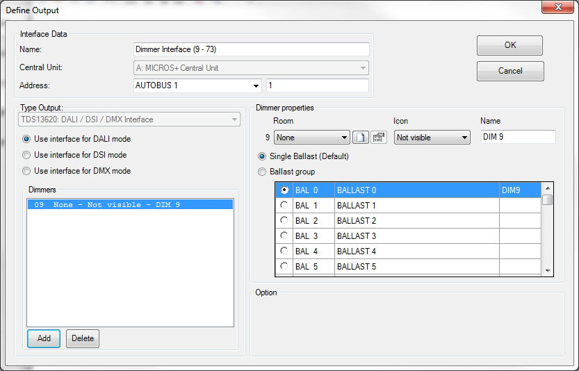 DALI est un protocole avec un seul ‘maître’ (le TDS13620) et jusqu’à 64 ballasts. Chaque ballast a une adresse de 0 à 63. L’avantage de DALI est que l’information du ballast peut être envoyé au ‘maître’ (p.ex. lampe défectueuse, panne de courant,…). Cette information est disponible dans DIAGNOSTICS.