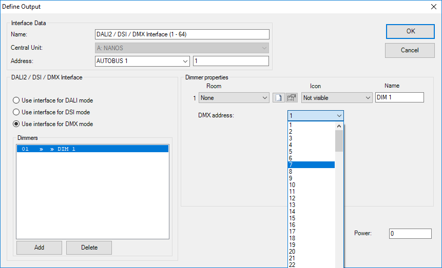 Afhankelijk van de modus kunt u tot 64 dimmers configureren op deze interface.
