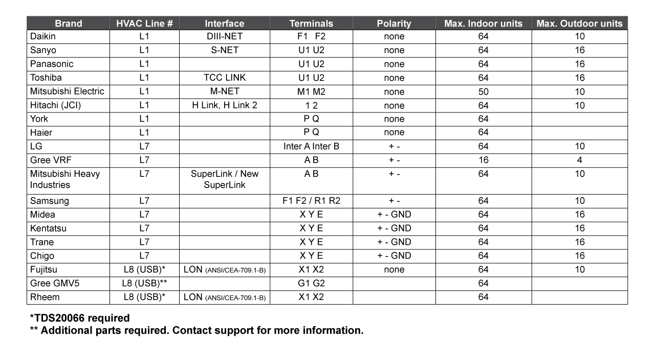 See the list of the supported HVAC models in the datasheet. If your required models are not listed, please contact your TELETASK supplier.
