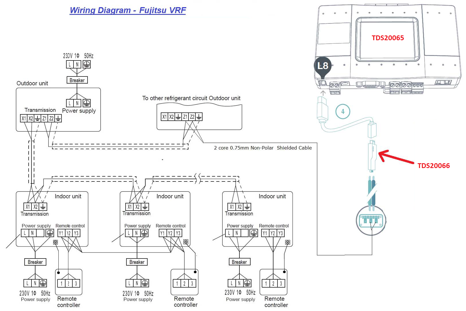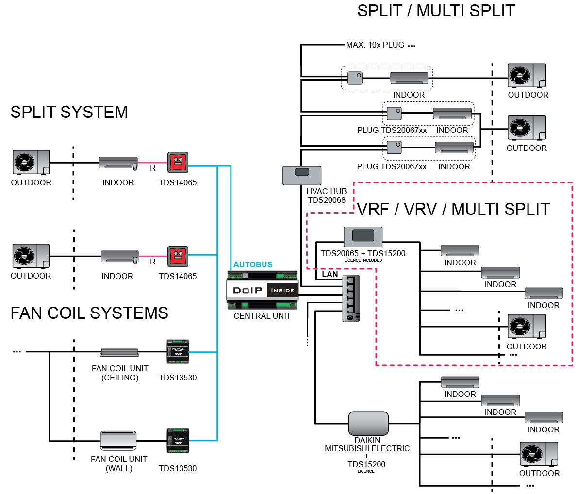 The TDS20065 is suited for controlling specific VRV/VRF units. Depending on the brand and the specific unit(s), the interface can be configured to integrate up to 32 indoor units (depending on the integrated HVAC type).