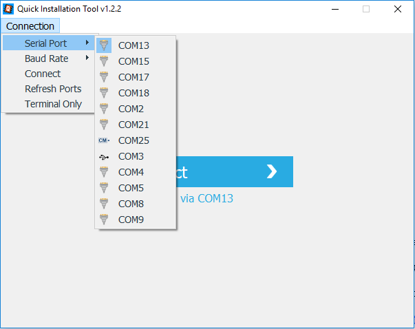 - In the menu Connection select the correct Serial Port, the one with the icon ‘CM’. In this example this is COM25: