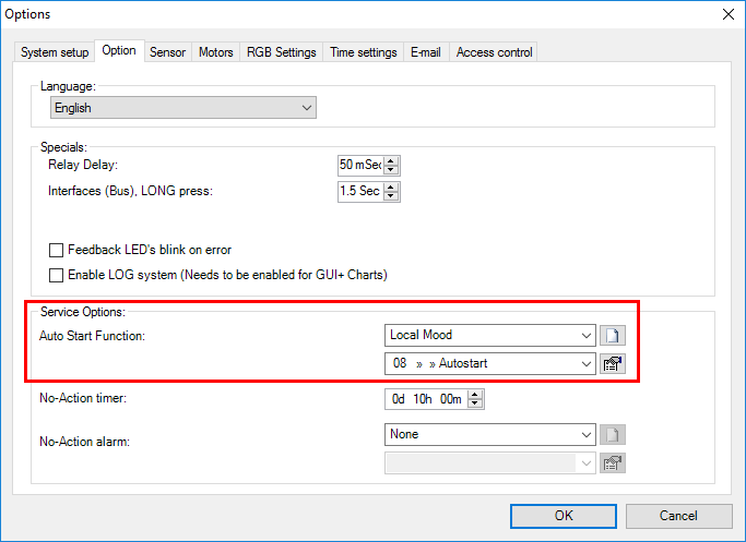 The parameters for the Auto start function are set in the PROSOFT 'option' menu. Under the tab page 'Option', you will find following parameters in the 'Service field:
