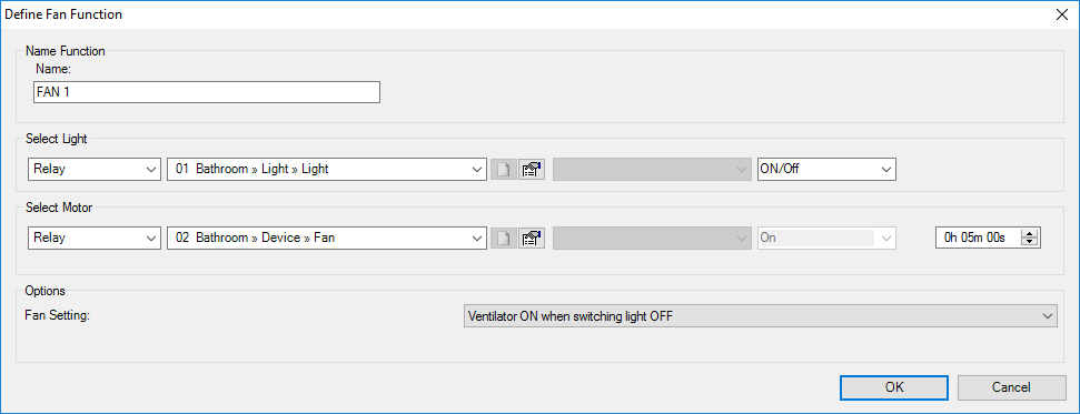 The Fan (exhaust) function switches a function and leaves a relay, dimmer, flag or local mood, in active mode for a preset time after the first function has been switched off.
