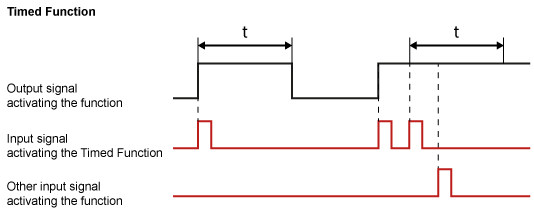 - If the selected output is in the state described in the ‘Timed function’, the output is switched OFF. If the selected output is not in the state described in the ‘Timed function’, the output is switched to this state and the timer is started. In both case this is regardless of whether the timer was running or not.