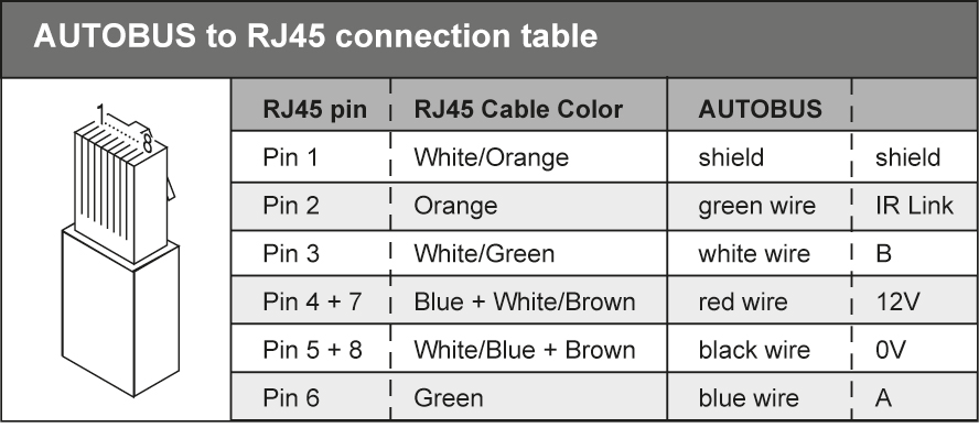 Omdat de leerbare UNIVERSELE RS232 AV INTERFACE een set top box is, heeft TELETASK gekozen voor een meer esthetische verbinding met de AUTOBUS. Deze verbinding loopt via een kort CAT5 path kabeltje met een RJ45 stekker in de muur. Achter deze stekker is de AUTOBUS beschikbaar. In de tabel hieronder kan u zien hoe de pin van de CAT5 kabel overeenstemt met de AUTOBUS bedrading.