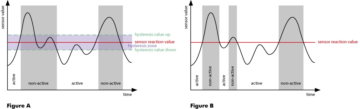 The result of using a hysteresis is that in case of balancing Lux values (in the Light sensor case) around the threshold value doesn't result in a constant changing control of the connected output (light, motor…). In practice this means that your light is not switching ON/OFF all the time and the sun shields are not opening and closing all the time (refer to the figures above).
