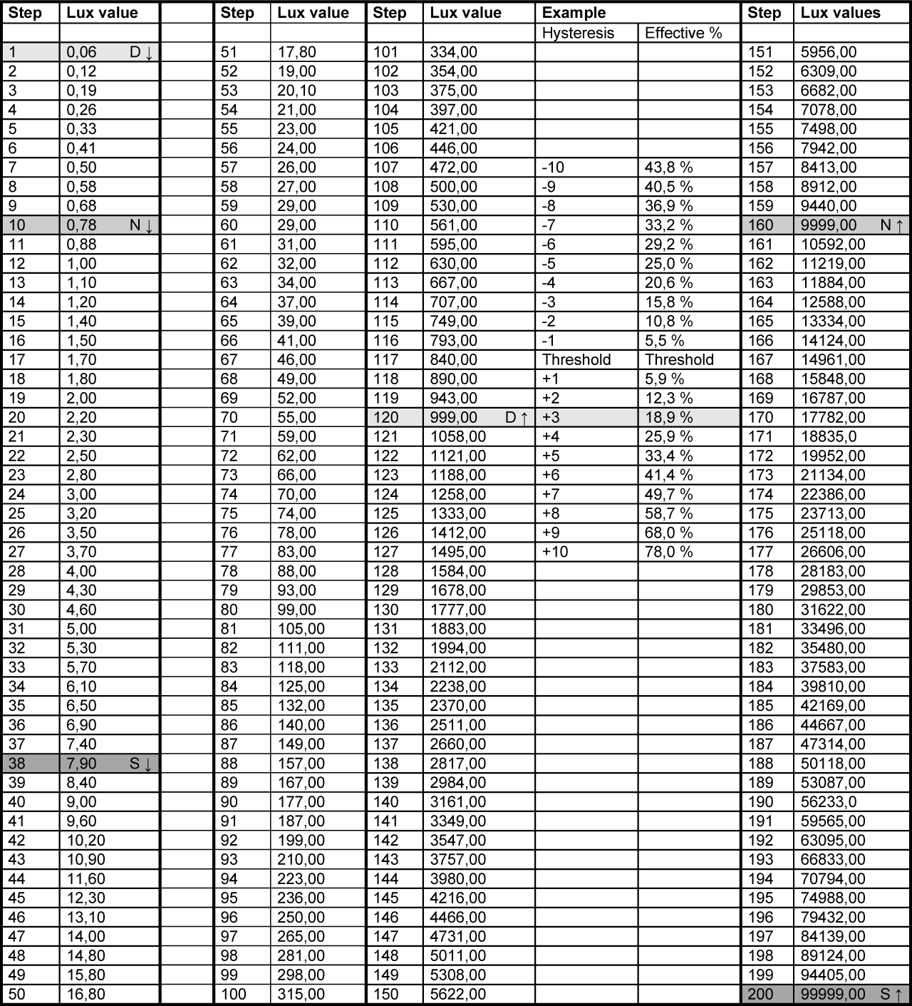 - Example: The hysteresis is set to 5 steps and the set 'day' threshold is 840 Lux. In the TELETASK Lux table you can see that the bottom hysteresis value, which is in this example 5 steps below, is 630 Lux and the top hysteresis level will be 5 steps up and is 1121 Lux.